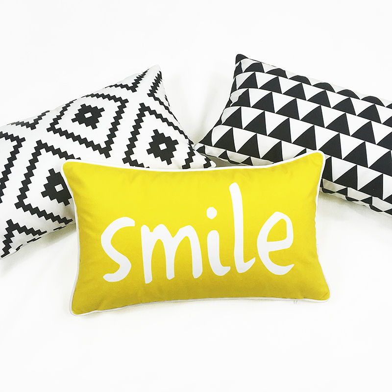 黄色い生地に白い文字「smile」入れたクッションカバーです。