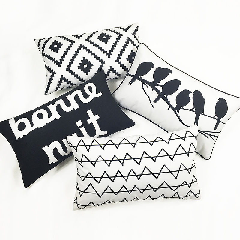 白い生地に黒い菱形モチーフの柄を入れたクッションカバーです。